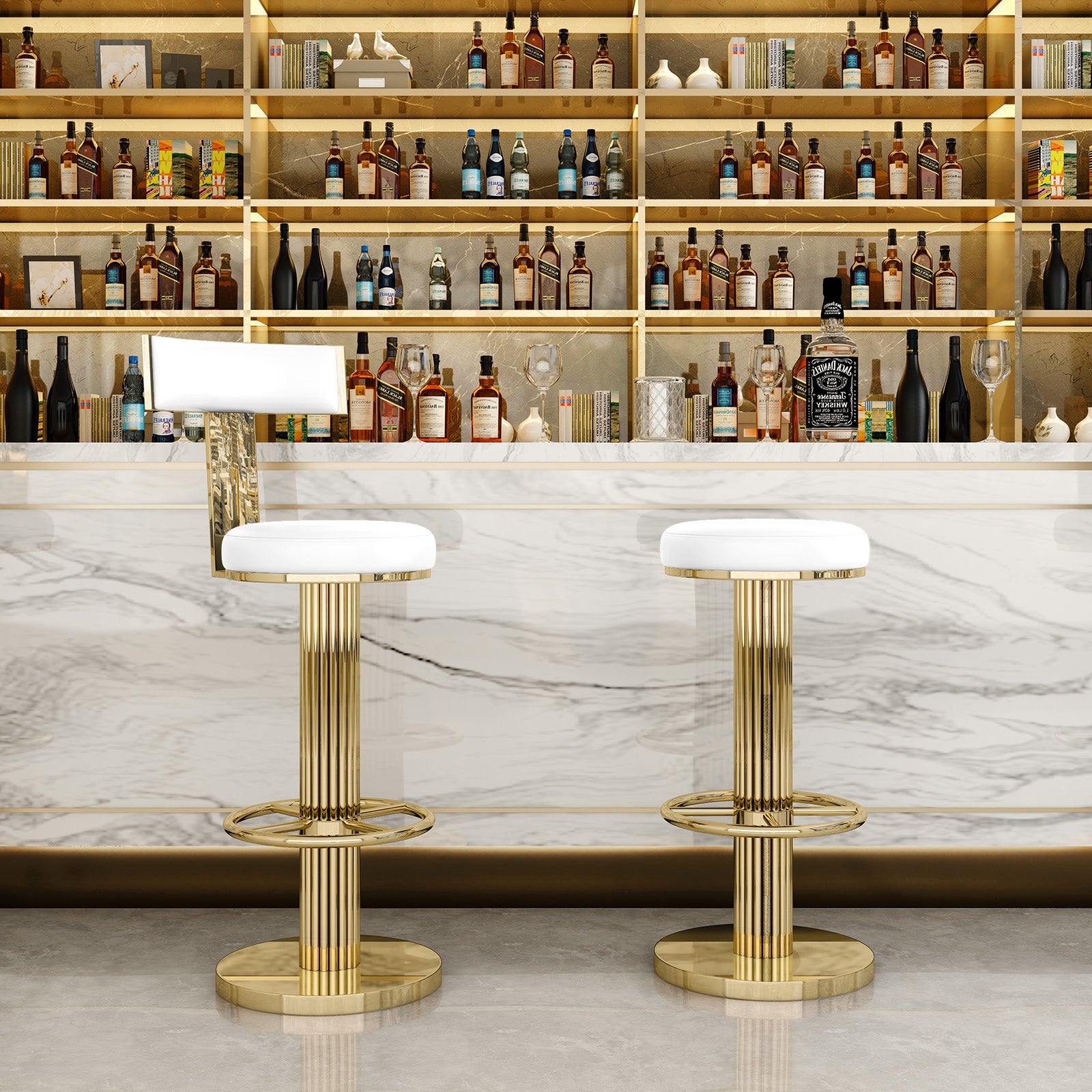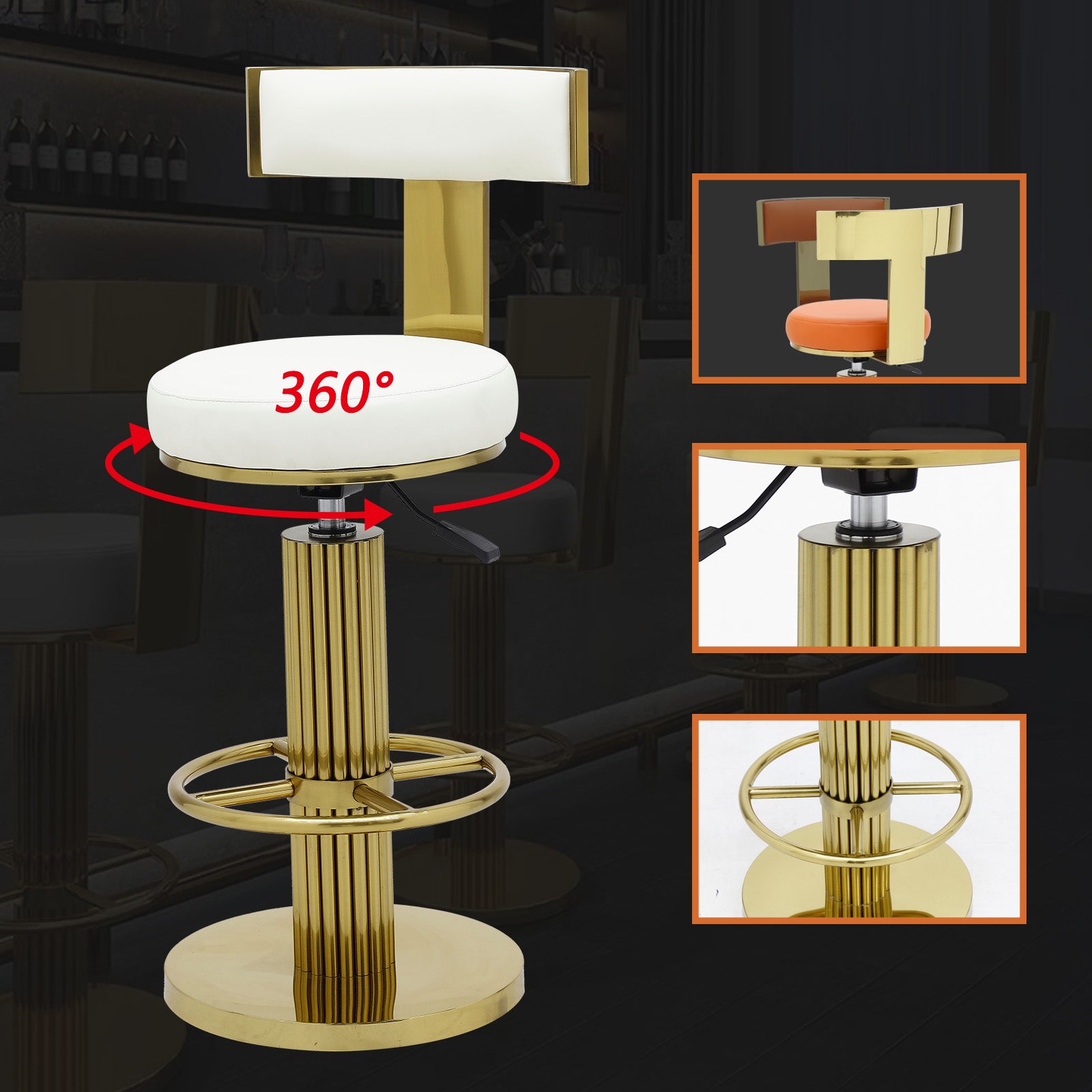 - 【Bar Stools For Kitchen Size】White Swivel Bar Chair with Back Size: 15"D x 15"W x 37.4"-41.3"H; Adjustable Seat Height Size: 25.6"-29.5"H; White Seat Cushion Size: 14.2"D; Stainless Steel Gold Base Dimensions: 15"D