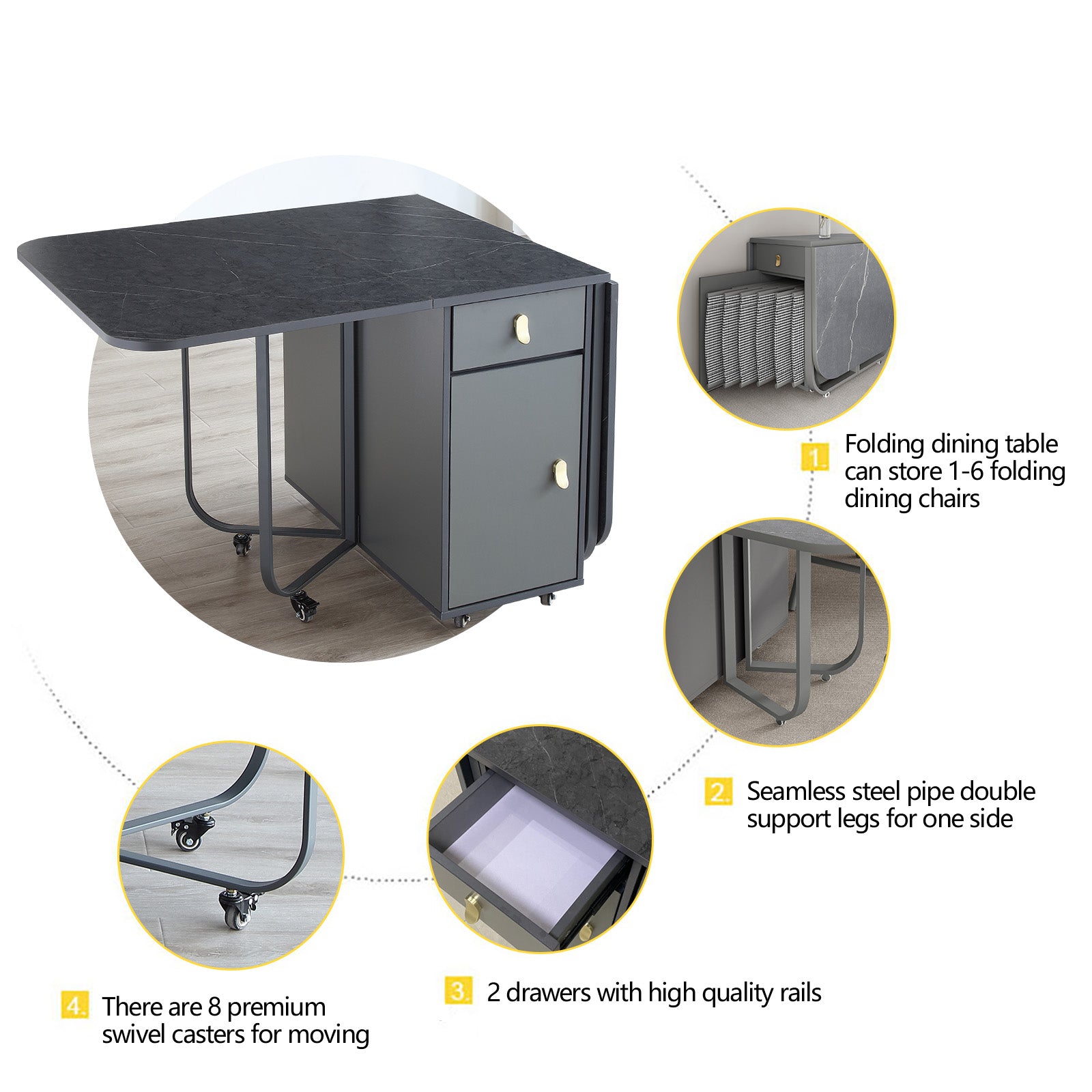 - 【Folding Dining Table for Small Spaces】This foldable table takes up little space when folded, it is very suitable for small spaces. Folding dining table with storage rack can store 1-6 folding chairs or kitchen utensils, drinks, etc. The two drawers on the side are perfect for storing everyday items like snacks, napkins and more.
