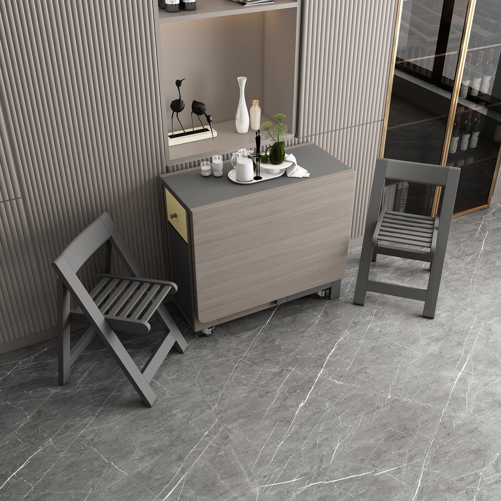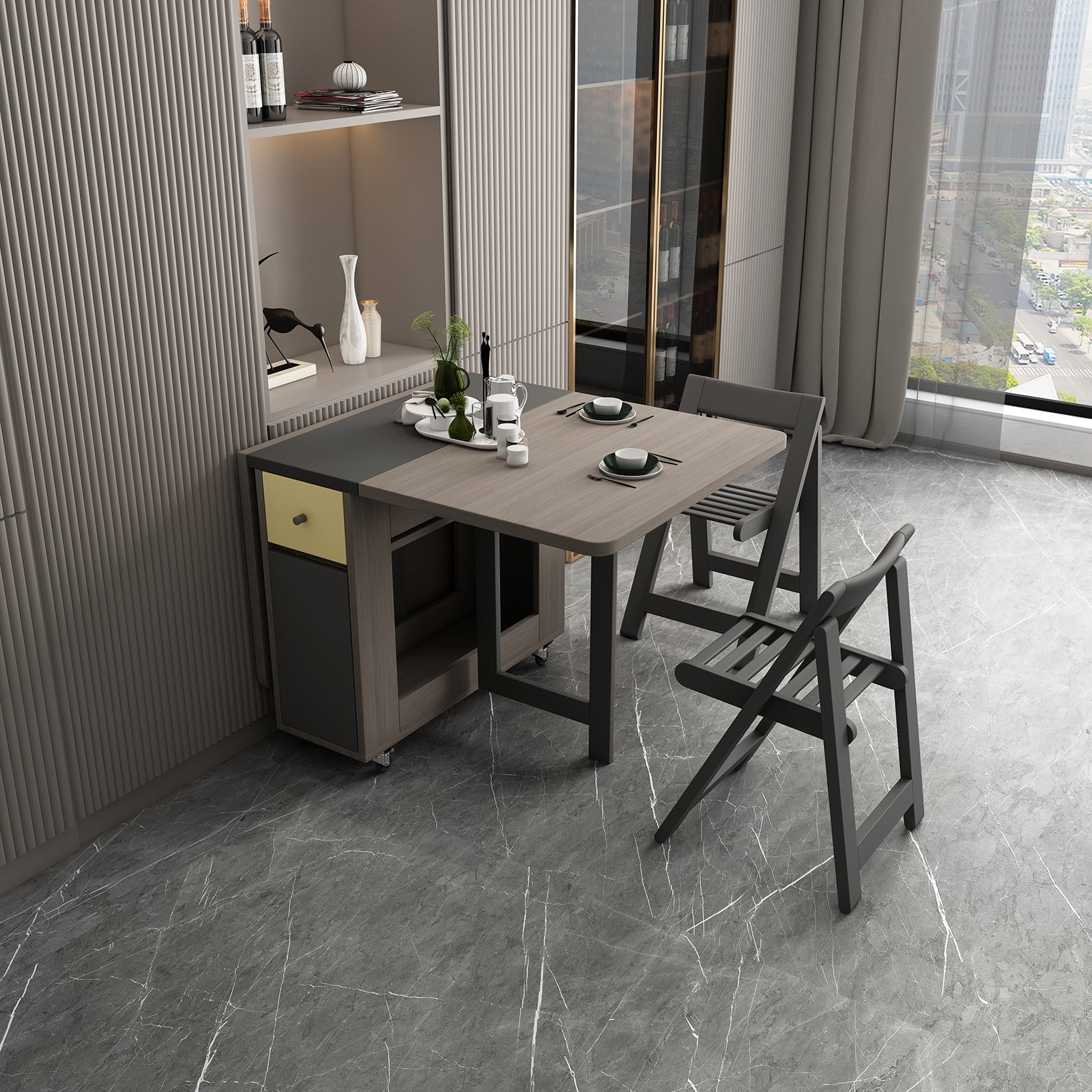 FUNROLUX Folding Dining Table with Storage Rack and 2 Drawers, Movable Kitchen Table Extendable Versatile Table Space Saving Foldable in 3 Forms (Grey)