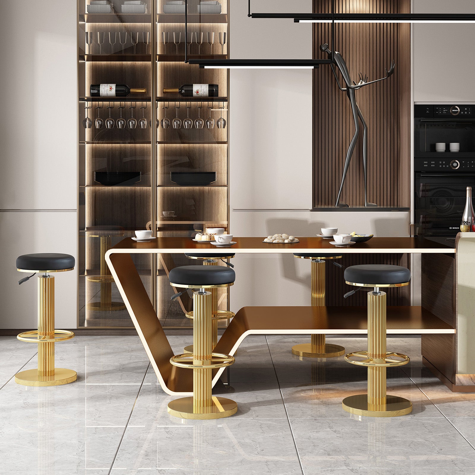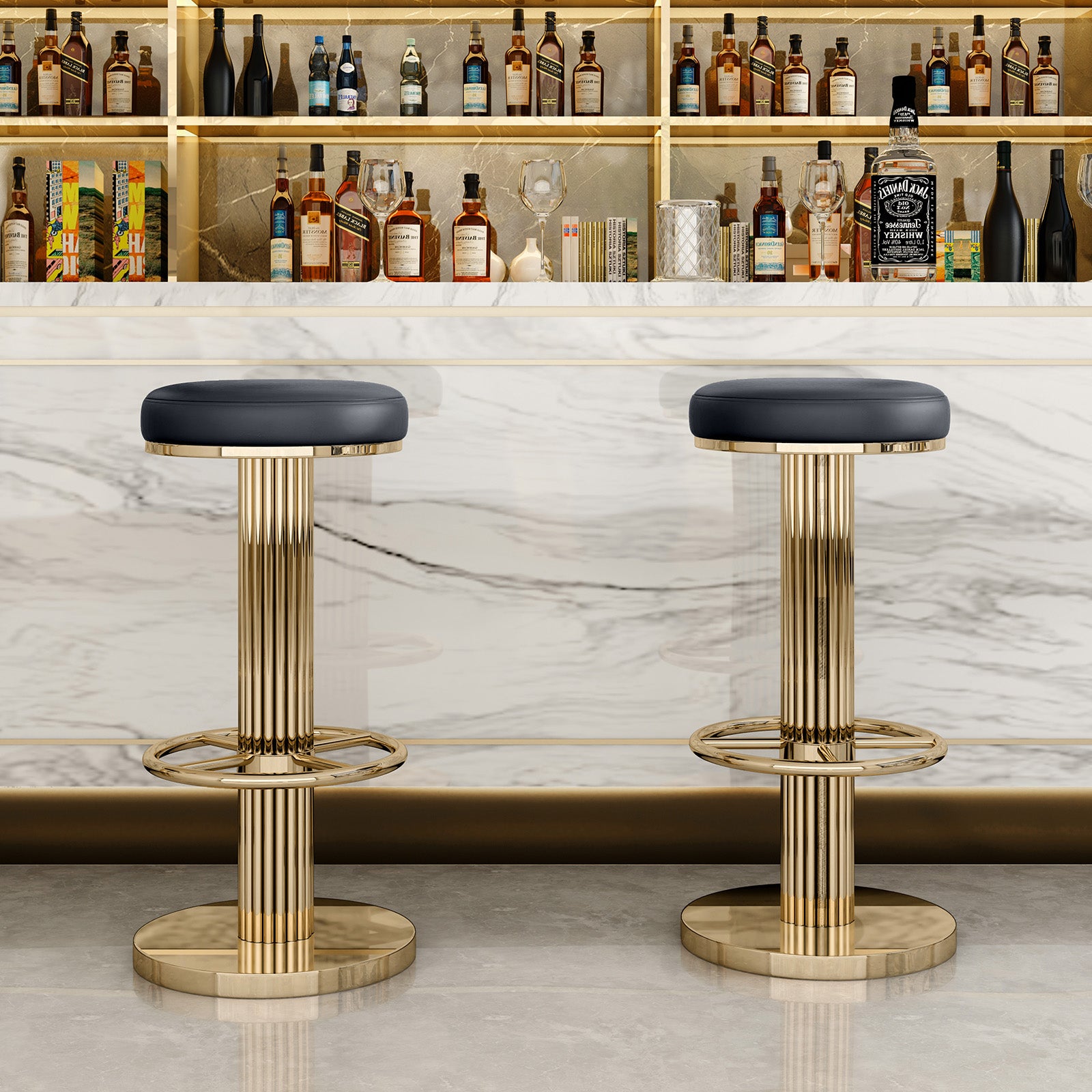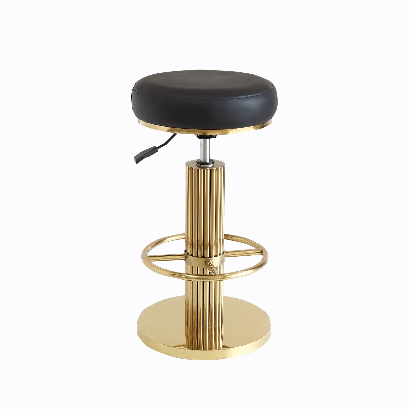 - 【360° Swivel & Adjustable Height】Gold bar stools are height adjustable between 25.6-29.5 inches for optimal comfort. The 360° swivel and backless design helps you reach items easily and maintain a comfortable sitting position.
