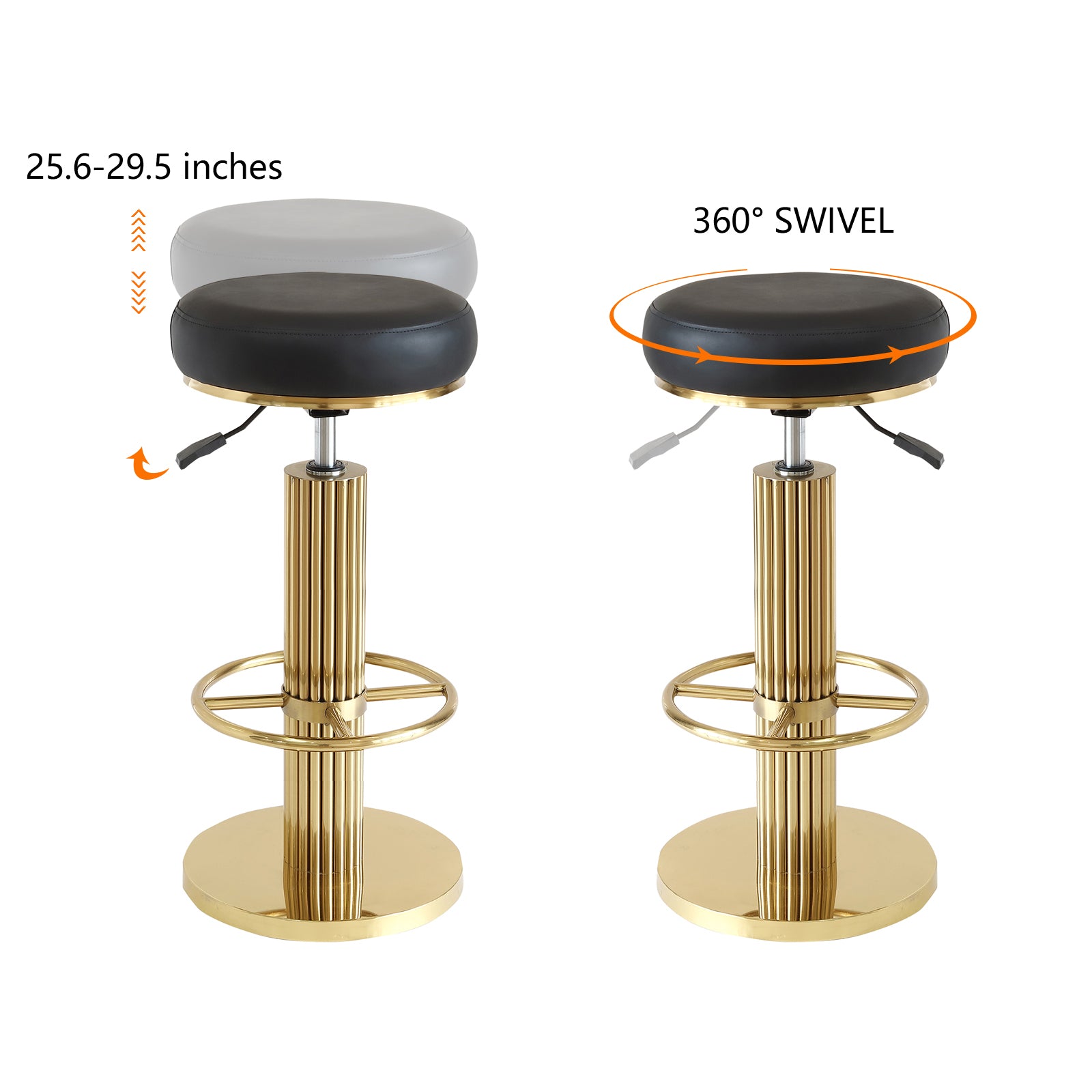 - 【Easy To Assemble 】The black and gold bar stools is easy to assemble and clean. All parts and hardware are included in the package. Swivel Bar Stools Size: 15 "D x 15 "W x 25.6"-29.5 "H; Seat Cushion Size: 14.2 "D; Stainless Steel Gold Base Size: 15 "D